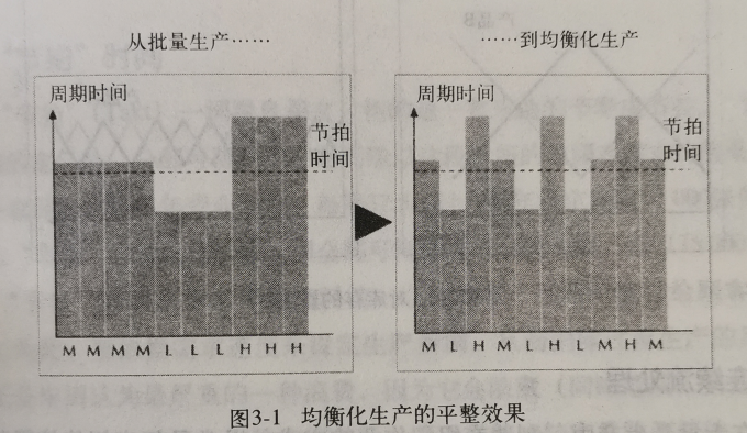 通過均衡化生產,如圖3-1的右側所示,就使工作內容的差異被消除,正如同在滾動平均(rolling average)圖中使數據的波峰波谷最后趨于平滑。這種方式必須依賴標準化的工作,以及技能高超與適應性強的人員。人員要達到這種素質并非易事,這也證明了管理架構對維系豐田生產系統的重要性。