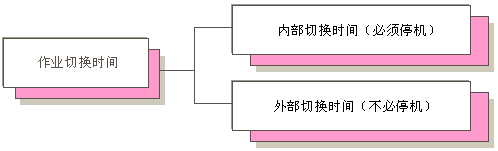 如圖所示,品種(作業(yè))切換時間主要可以劃分為內(nèi)部切換時間和外部切換時間。在JIT方式下,流水線的換線只需要將新的產(chǎn)品送到第一個工序,后面跟著生產(chǎn)線流動,這樣就能順利地完成換線。因此,流水線的換線屬于外部切換,不需要停機,切換時間較短。但是,模具、刀具和工裝夾具等的切換必須停機,流水線將會中斷。