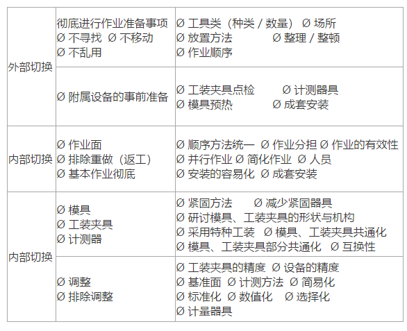 因為要經(jīng)常變換生產(chǎn)的產(chǎn)品品種,因此在生產(chǎn)流水線的運作過程中,就涉及到品種切換的時間問題。切換動作包括模具、刀具、工裝夾具的切換,組裝生產(chǎn)之零部件、材料的切換,基準變更的切換和制造前的一般準備作業(yè)。