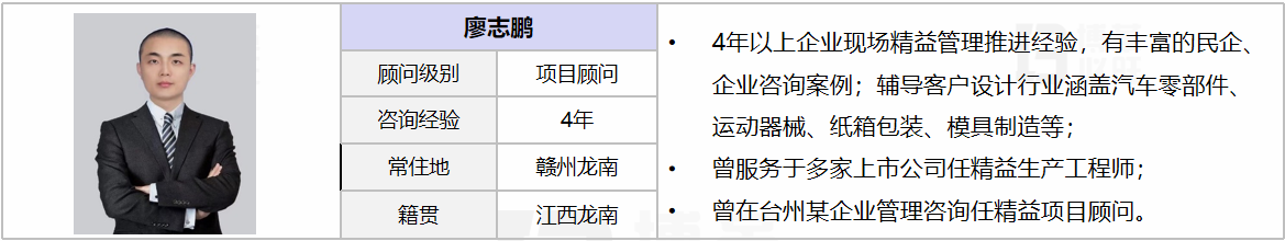 擅長業務:工廠前期調研診斷、項目管理、現場基礎管理提升、精益布局規劃、大型倉儲規劃、改善項目落地、IE改善手法、質量管理、QCD降本增效改善、精益生產配送管理、精益生產項目的推進、標準工時開發、SMED快速換模換線、現場5S改善、與目視化提升、基層培養-打造班組管理、精益體系建立及改善輔導實施跟進,KAIZEN持續改善、流程再造,3P、定制化生產線搭建,非標工裝自動化設備開發與導入。