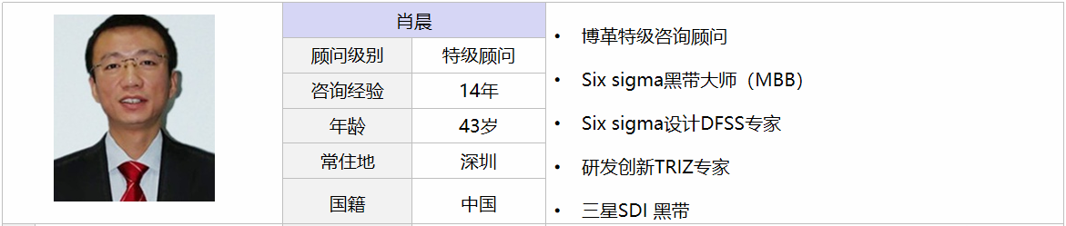 實(shí)戰(zhàn)經(jīng)驗(yàn):豐富的企業(yè)導(dǎo)入精益Six sigma管理,變革企業(yè)文化和提升員工素質(zhì)水平,診斷、細(xì)化、優(yōu)化、再造企業(yè)核心流程,引入世界先進(jìn)管理手段都有豐富的經(jīng)驗(yàn)。 曾為幾十家企業(yè)提供精益Six sigma項(xiàng)目咨詢服務(wù),主導(dǎo)10余家企業(yè)的精益Six sigma管理, 輔導(dǎo)超過(guò)500個(gè)精益Six sigma項(xiàng)目, 授課人數(shù)超過(guò)1500人次,為企業(yè)帶來(lái)超過(guò)8000萬(wàn)的項(xiàng)目收益,受到顧客的高度認(rèn)可。曾為企業(yè)培養(yǎng)內(nèi)部講師、內(nèi)部黑帶大師、內(nèi)部管理師超過(guò)200名,很多學(xué)員走上更高領(lǐng)導(dǎo)崗位,適合企業(yè)持續(xù)管理推進(jìn)的需要。 曾在國(guó)內(nèi)知名電器企業(yè)任職總裁辦公室高級(jí)經(jīng)理,主要負(fù)責(zé)企業(yè)Six sigma管理的推進(jìn),企業(yè)內(nèi)部Six sigma授課,精研統(tǒng)計(jì)技術(shù)和統(tǒng)計(jì)軟件,熟悉各種方法論的現(xiàn)場(chǎng)實(shí)踐,具有豐富的實(shí)操經(jīng)驗(yàn)和能力。