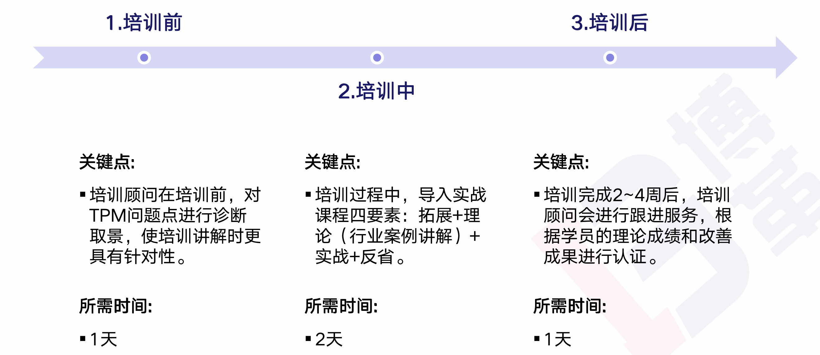 公司的中高層領導、相關部門需給予資源上的支持,培訓倡導者需參加開課儀式和課程總結;培訓小組成員需帶領員工一起改善,形成合員參與的精益氛圍。