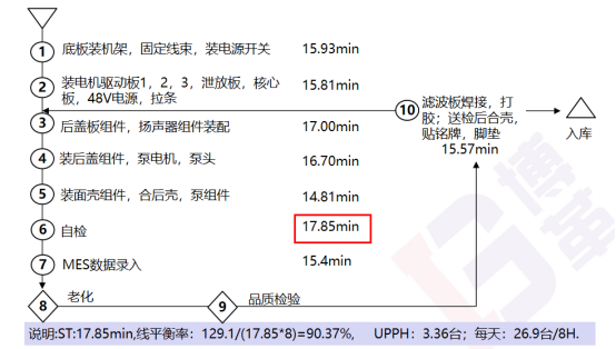 通過連續流布局,配配用設備嵌入生產線,減少生產斷點與搬運,斷點由12降到3個,生產過程搬運距離由860米降到60m