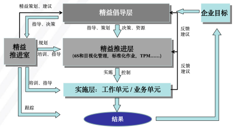 1)精益的有效開展需要建立對(duì)結(jié)果負(fù)責(zé)的精益組織,根據(jù)企業(yè)目標(biāo),精益推進(jìn)工作室,協(xié)助精益倡導(dǎo)層,推進(jìn)層和實(shí)施層,分解項(xiàng)目目標(biāo),制定項(xiàng)目計(jì)劃,共同達(dá)成項(xiàng)目目標(biāo)。