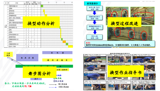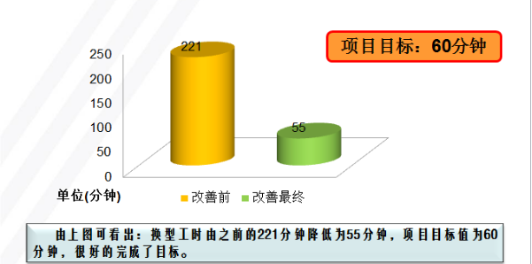 6)快速換模:通過換形動(dòng)作分析,換形過程中舞步圖分析,制定換形改善方案,并建立換形標(biāo)準(zhǔn)作業(yè)指導(dǎo)書,換形時(shí)間由221分鐘降低至55分鐘。
