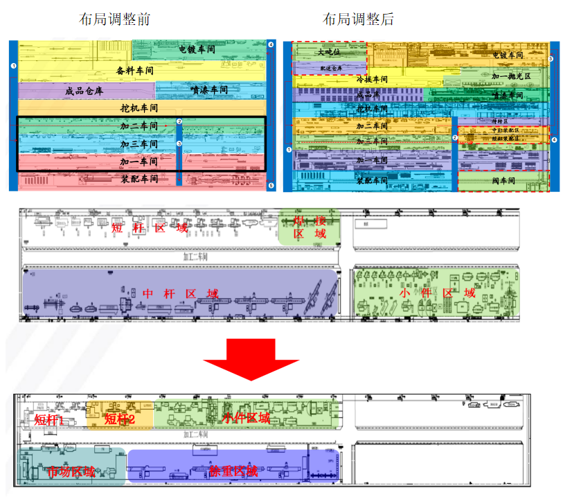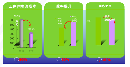 1)精益布局調(diào)整,調(diào)整后,物流成本降低50%,效率提升30%,面積占用降低15%。
