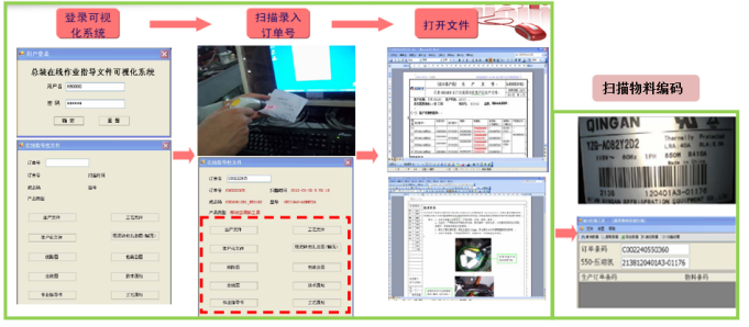關(guān)鍵重點(diǎn)物料防錯(cuò)掃描及可視化系統(tǒng),掃描訂單號(hào)后自動(dòng)顯示該崗位相應(yīng)工藝文件,指導(dǎo)員工裝配并保證信息為最新要求;掃描物料條碼,系統(tǒng)自動(dòng)判定使用物料與訂單需求是否一致。