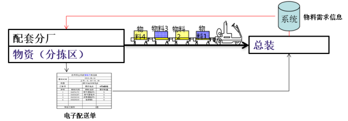 配送,根據(jù)生產(chǎn)計(jì)劃和生產(chǎn)線物料需求,系統(tǒng)自動(dòng)生產(chǎn)物料配送單,按單齊套物料,定時(shí)定點(diǎn)配送到總裝工位;