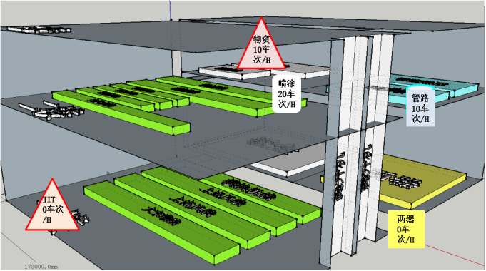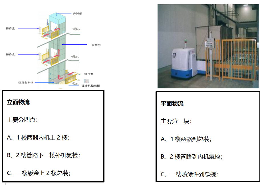 提升機(jī):立面物流采用提升機(jī),主要應(yīng)用在成品入庫(kù),分揀好配套物資到總裝;