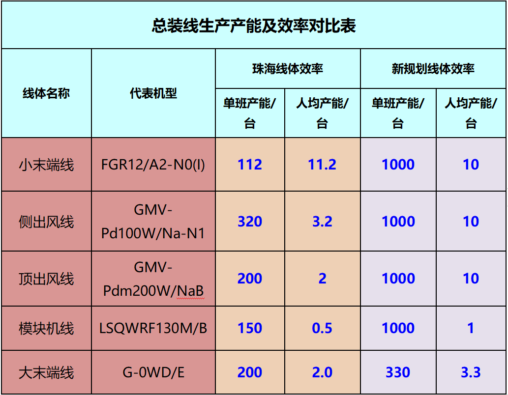 新規(guī)劃及現(xiàn)有基地商用總裝線的產(chǎn)能及效率如下表: