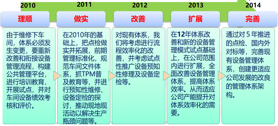 上海普華TPM圍繞著效率化維修戰(zhàn)略,本著循序漸進,一步一個腳印的原則進行五年規(guī)劃,按照2010年理順、2011年做實、2012年改善、2013年擴展、2014年完善的計劃進行輔導(dǎo);