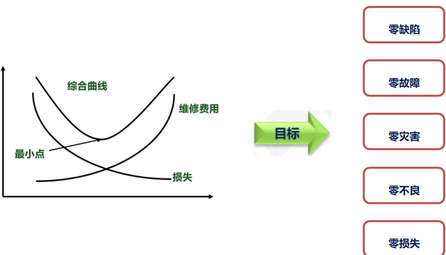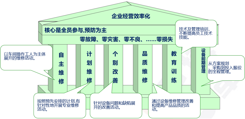 通過全員生產(chǎn)維護和持續(xù)改善,最大限度提高設(shè)備綜合效率、延長設(shè)備使用壽命為目標,使生產(chǎn)效益最大化,最終實現(xiàn)零缺陷、零故障、零災(zāi)害、零不良、零損失 。