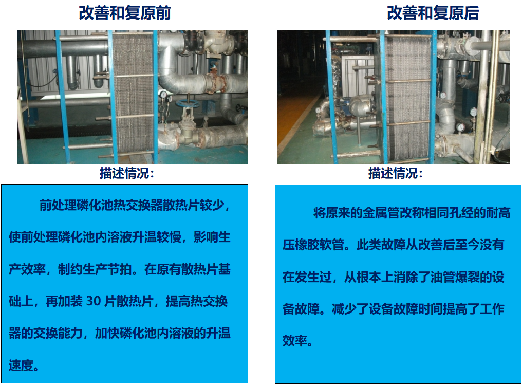 通過改善使前處理的生產(chǎn)效率提高了,以每輛車節(jié)約20秒的磷化時間,全年生產(chǎn)4.2萬輛車計算,全年可減少開機時間:42000*15/(60*60)=175小時,前處理每小時能耗850元,每人每小時12元工資,前處理班組25人,則全年可為公司節(jié)約: (850+12*25)*175=201250元。