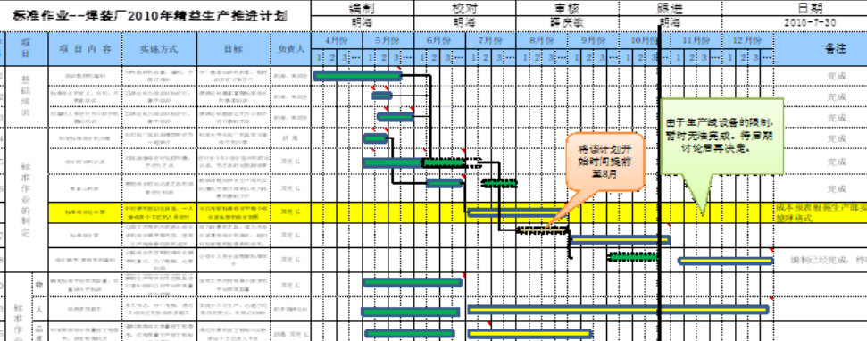 根據(jù)公司的經(jīng)營目標及發(fā)展方向,提高廠能拉動生產(chǎn)已迫在眉睫;而要加快生產(chǎn)節(jié)拍必須先規(guī)范標準作業(yè)。標準作業(yè)是為了實現(xiàn)作業(yè)人員、作業(yè)順序、工序設(shè)備的布置、物流過程等的最優(yōu)化組合設(shè)立的作業(yè)方法。為了實現(xiàn)以低廉的成本生產(chǎn)出優(yōu)質(zhì)產(chǎn)品的一個作業(yè)基準,項目組首先定年度推進計劃;