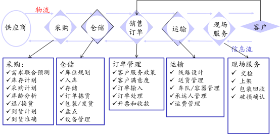 通過梳理醫(yī)藥物流的關鍵環(huán)節(jié),分析關鍵流程(供應商管理、采購、倉儲、銷售訂單、運輸、現(xiàn)場服務)的績效指標設置及表現(xiàn)進行診斷: