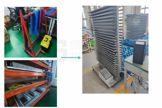 方案:車間裝配物料按機臺統一放置到物料車,方便拿用,現場整齊,紙箱統拆包裝膠箱上貨架再上生產車間(特殊配件原包裝上貨架上車間.