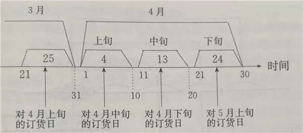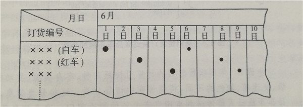 步驟1 來(lái)自銷售商的旬訂貨,各銷售商在汽車廠基本生產(chǎn)計(jì)劃確定的本月領(lǐng)取輛數(shù)的范圍內(nèi),將最終分規(guī)格的10天份的訂貨在7天至8天前通過(guò)微機(jī)聯(lián)網(wǎng)提供給汽車廠的銷售部門(參看圖1)。所謂最終規(guī)格,就是將剛才講過(guò)的按大分類的規(guī)格的車型,進(jìn)一步通過(guò)對(duì)任選部件(訂貨要求的裝備)的選擇、車的顏色的選擇細(xì)分后的規(guī)格。接著,在生產(chǎn)管理部門按照旬訂貨來(lái)計(jì)劃分工廠,分生產(chǎn)線的日產(chǎn)量,這就是對(duì)前面所講述的基本生產(chǎn)計(jì)劃的修正,另外,豐田汽車公司還要向各家銷售商報(bào)告圖2那樣的配送預(yù)定表( Delivery Schedule),這個(gè)預(yù)定表的編制,從接受旬訂貨開(kāi)始需要兩天的時(shí)間。