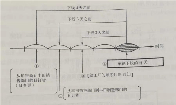 經(jīng)過(guò)由這樣四個(gè)階段組成的訂貨過(guò)程,從銷售商向豐田汽車公司的銷售部門提出訂貨僅僅四天之后,成品車就能從最終裝配線上下線。而且實(shí)際的生產(chǎn)過(guò)程時(shí)間,從車體焊接線的始端到最終裝配線的末端,只被限定了一天的時(shí)間。但是,實(shí)際的運(yùn)送時(shí)間和裝船所需要的時(shí)間,因?yàn)榫嚯x不同,每家銷售商就不一樣了。